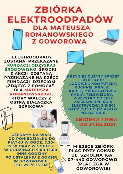 Do 31 maja potrwa zbiórka elektroodpadów w Goworowie, która ma na celu pozyskanie środków na leczenie Mateusza Romanowskiego, walczącego z ostra białaczką limfoblastyczną.