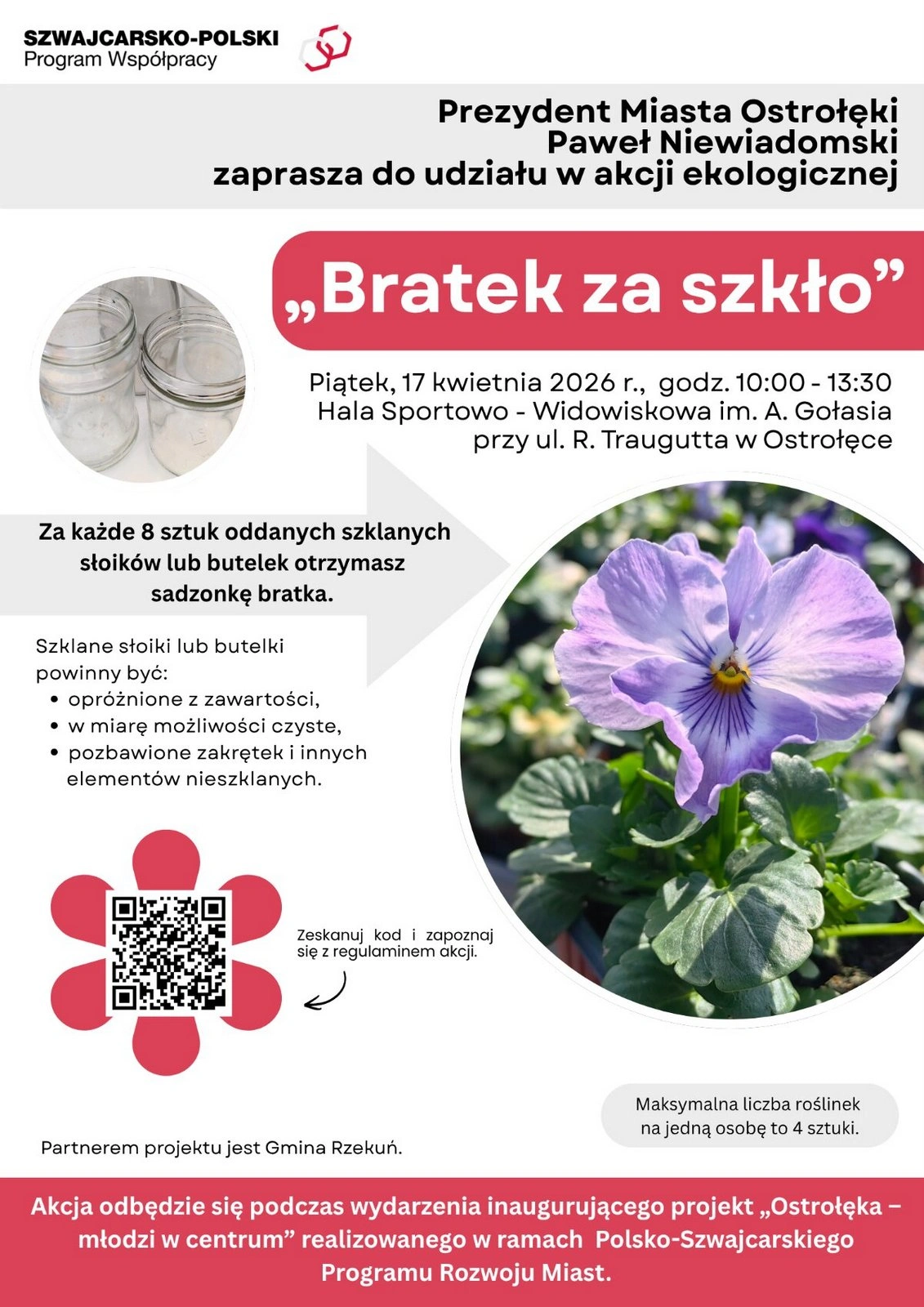 Prezydent Ostrołęki Paweł Niewiadomski zaprasza mieszkańców do udziału w akcji edukacyjnej 'Bratek za szkło”, realizowanej w ramach Polsko-Szwajcarskiego Programu Rozwoju Miast. Odbędzie się 17 kwietnia w godzinach 10:00–13:30 podczas inauguracji projektu 'Ostrołęka – młodzi w centrum” w Hali Sportowo-Widowiskowej im. Arkadiusza Gołasia przy ulicy Traugutta.