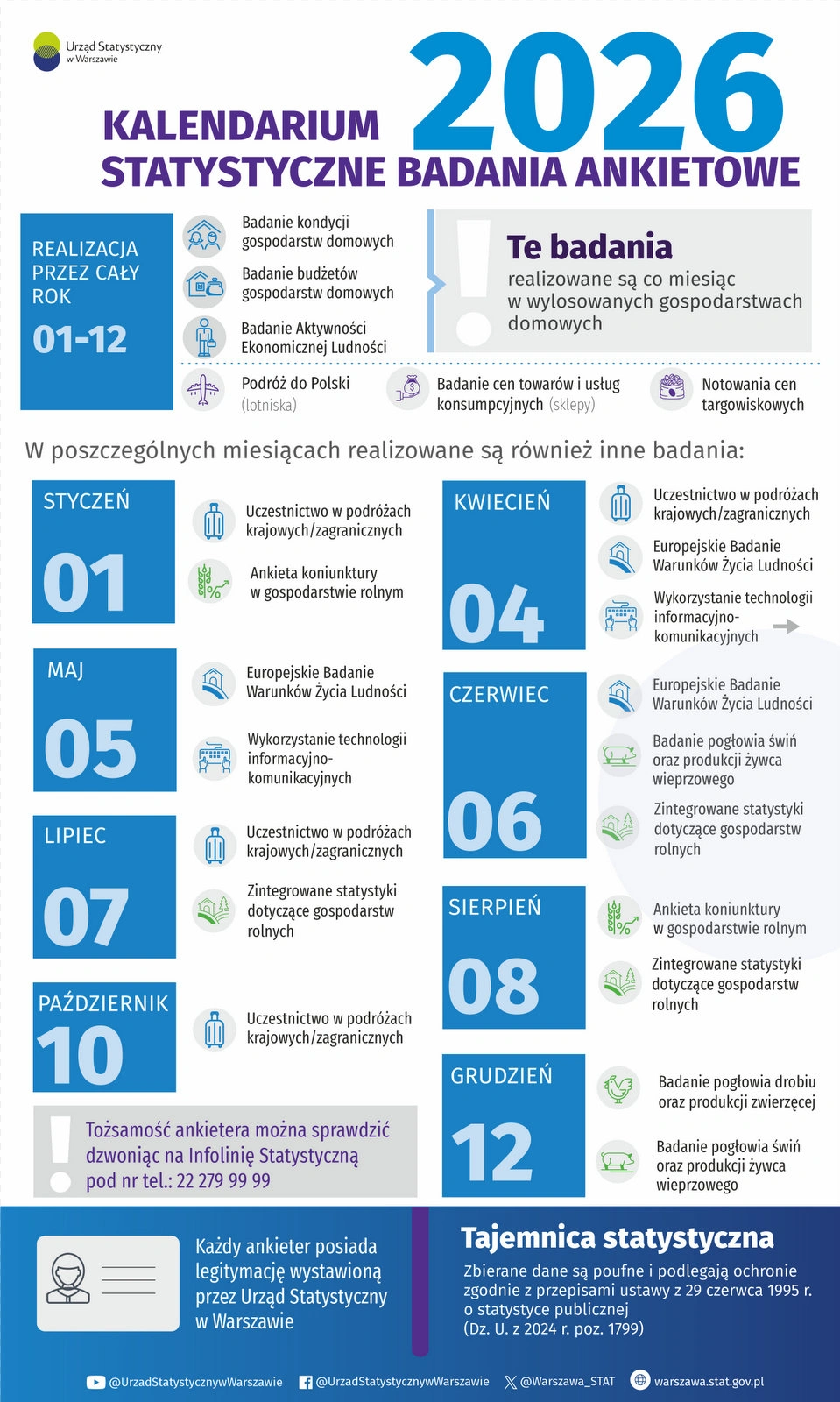 Każde gospodarstwo może zostać wylosowane do udziału, dlatego warto wiedzieć, że ankieterzy pracują przez cały rok, a kalendarium badań dostępne jest na stronie Urzędu Statystycznego w Warszawie.