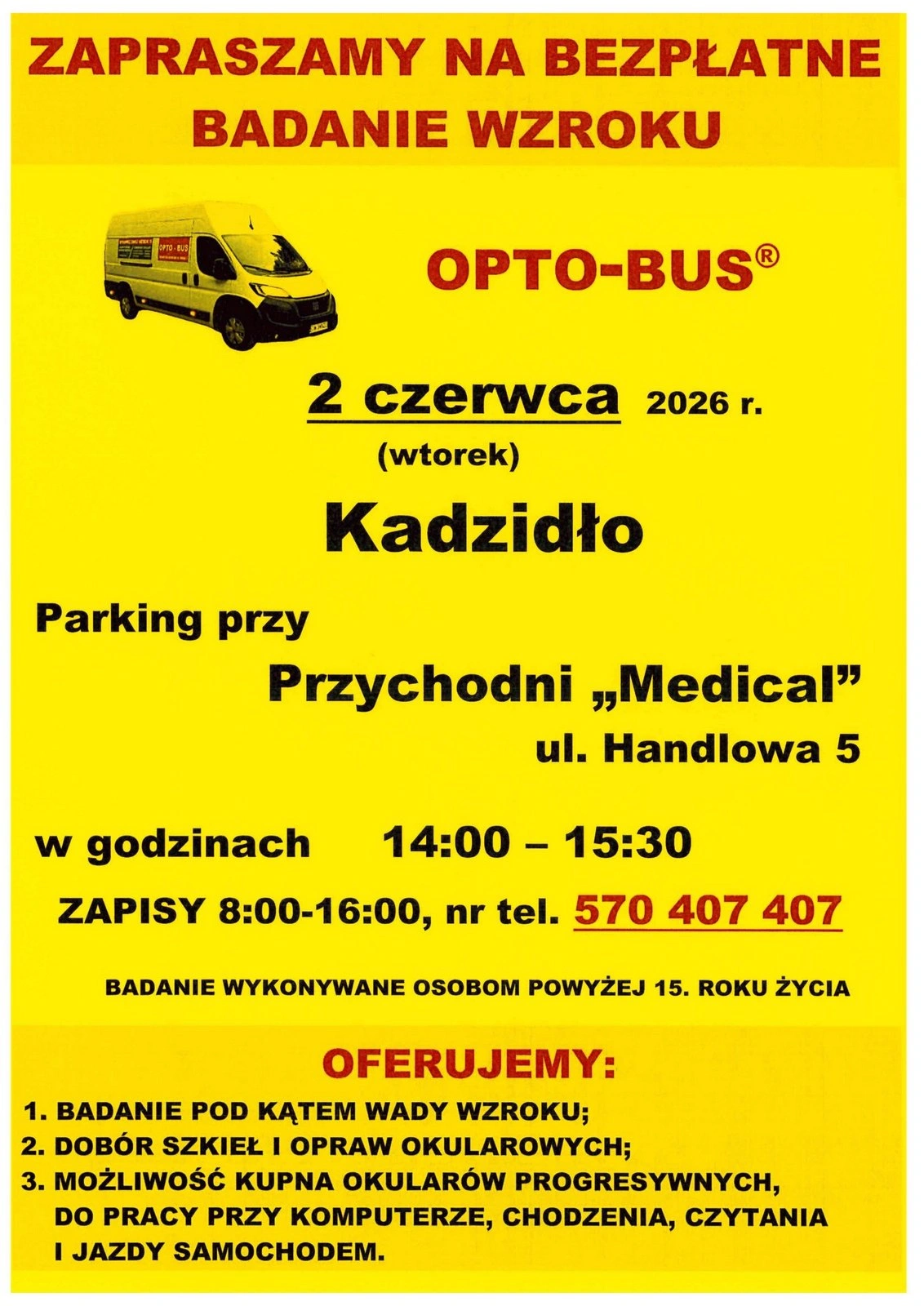 Mieszkańcy Kadzidła będą mogli 2 czerwca skorzystać z bezpłatnego badania wzroku w mobilnym gabinecie OPTO-BUS. Pojazd stanie na parkingu przy ulicy Handlowej 5. Badania będą prowadzone w godzinach od 14 do 15:30 i są przeznaczone dla osób powyżej 15. roku życia.