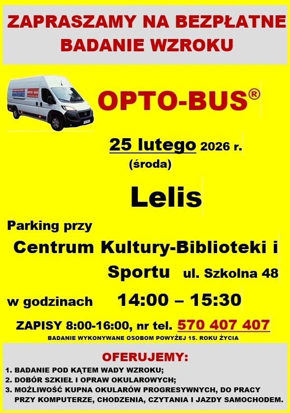 Mieszkańcy Lelisa będą mogli 25 lutego skorzystać z bezpłatnego badania wzroku w mobilnym gabinecie OPTO-BUS. Pojazd stanie na parkingu przy Centrum Kultury, Biblioteki i Sportu przy ulicy Szkolnej 48. Badania będą prowadzone w godzinach od 14 do 15:30 i są przeznaczone dla osób powyżej 15. roku życia.