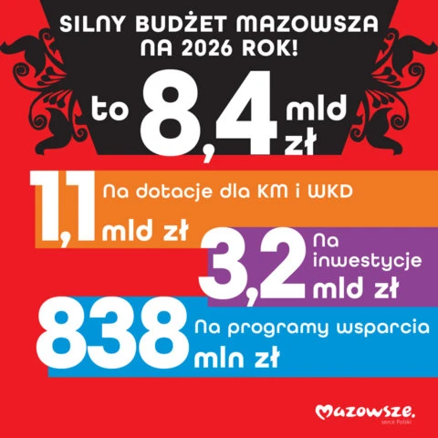 Radni województwa mazowieckiego przyjęli budżet na 2026 rok. Wynosi on ponad 8,4 mld zł. Na modernizacje i rozbudowy dróg, szpitali, instytucji kultury czy szkół władze regionu przeznaczą ponad 3,2 mld zł. Na wsparcie gmin, powiatów i organizacji pozarządowych w ramach programów wsparcia przekazanych zostanie ponad 838 mln zł, a 1,1 mld zł na dotacje dla KM i WKD.