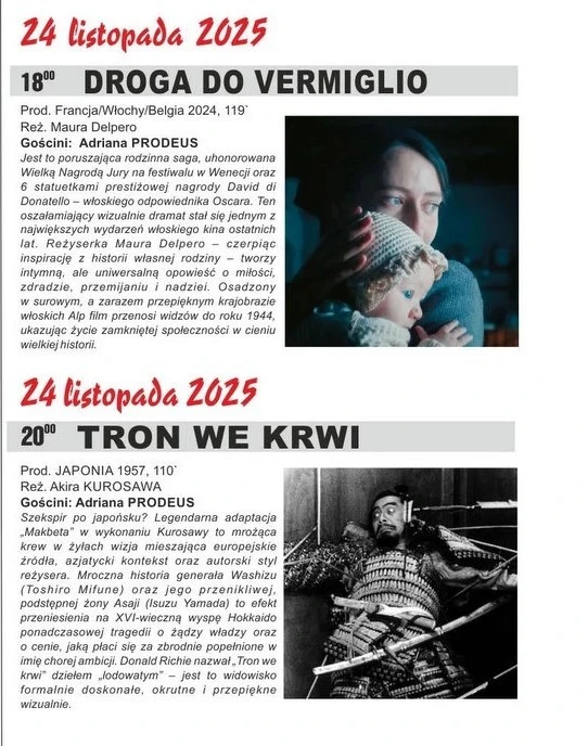 O godzinie 20:00 zaplanowano pokaz filmu 'Tron we krwi’, japońską adaptację 'Makbeta”.