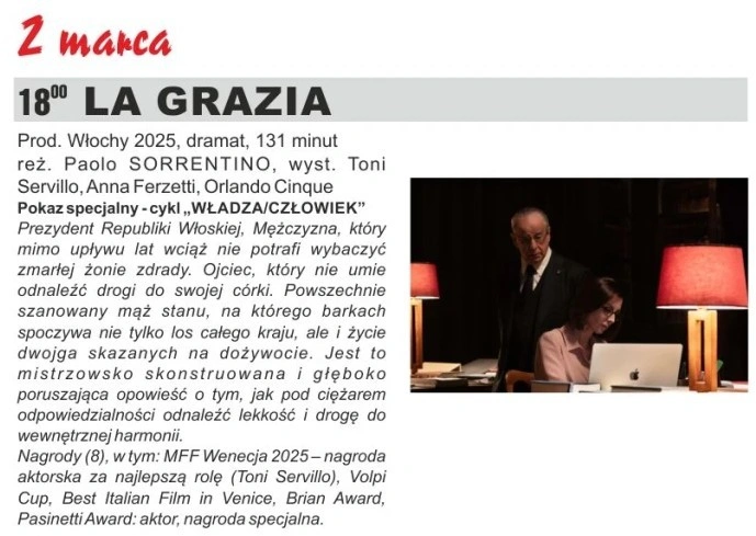 ’La Grazia’ to mistrzowsko skonstruowana i głęboko poruszająca opowieść z nagrodzoną w Wenecji, wybitną rolą Toniego Servillo. Laureat Oscara Paolo Sorrentino, twórca 'Wielkiego piękna’ i 'Młodości’, powraca z przewrotną, pełną subtelnego humoru historią o dylematach i uczuciach, które nie dają spokoju. O tym, jak pod ciężarem odpowiedzialności odnaleźć lekkość i drogę do wewnętrznej harmonii.