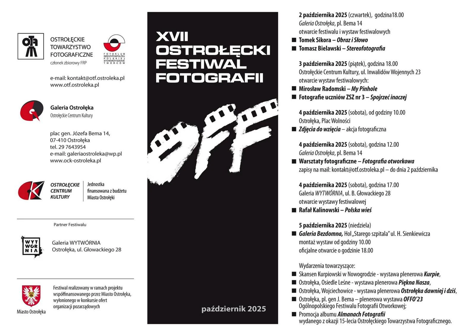 W sobotę, 4 października, festiwal wyjdzie w przestrzeń miasta. Od godziny 10.00 na placu Wolności przy DH Kupiec odbędzie się akcja 'Zdjęcia do wzięcia”, podczas której mieszkańcy będą mogli otrzymać fotografie do zabrania ze sobą. O 12.00 w Galerii Ostrołęka ruszą warsztaty fotografii otworkowej prowadzone przez Mirosława Radomskiego. Wieczorem, o godzinie 17.00, w Galerii Wytwórnia przy ul. B. Głowackiego 28 otwarta zostanie wystawa Rafała Kalinowskiego 'Polska wieś”.