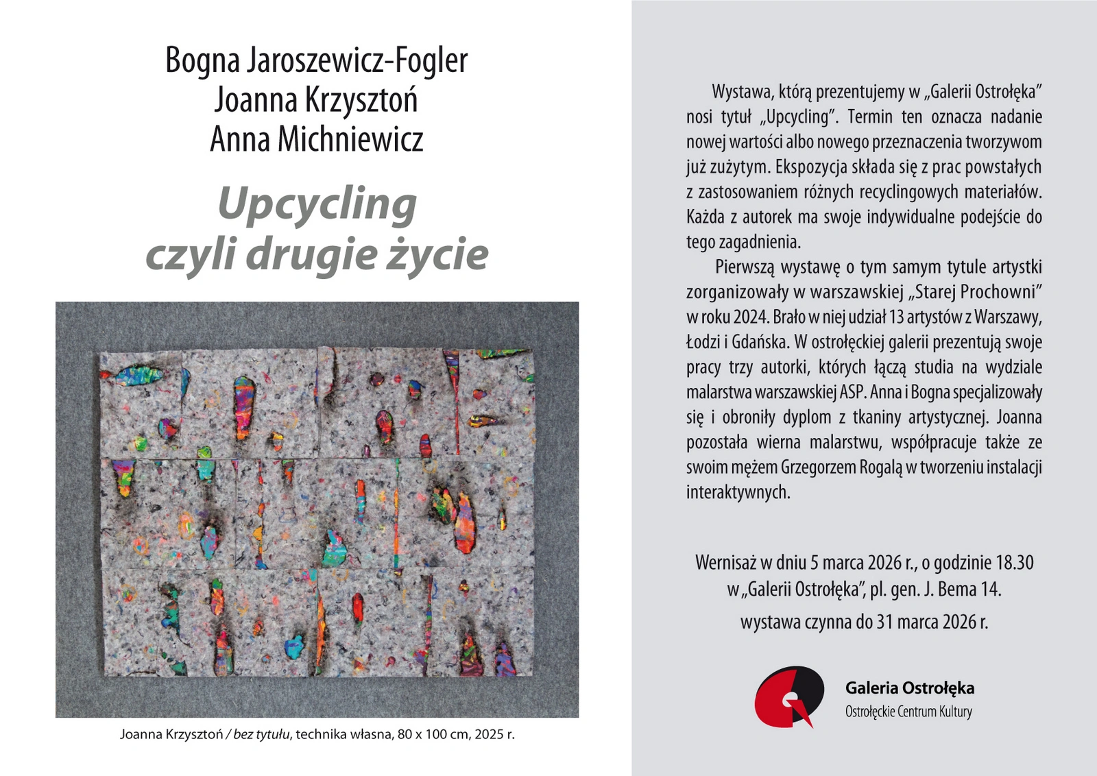 Galeria Ostrołęka zaprasza 5 marca na wernisaż wystawy 'Upcycling, czyli drugie życie”, prezentującej prace Joanny Krzysztoń, Anny Michniewicz oraz Bogny Jaroszewicz-Fogler. Ekspozycja pokazuje, jak zużytym materiałom można nadać nową wartość i zupełnie nowe znaczenie.