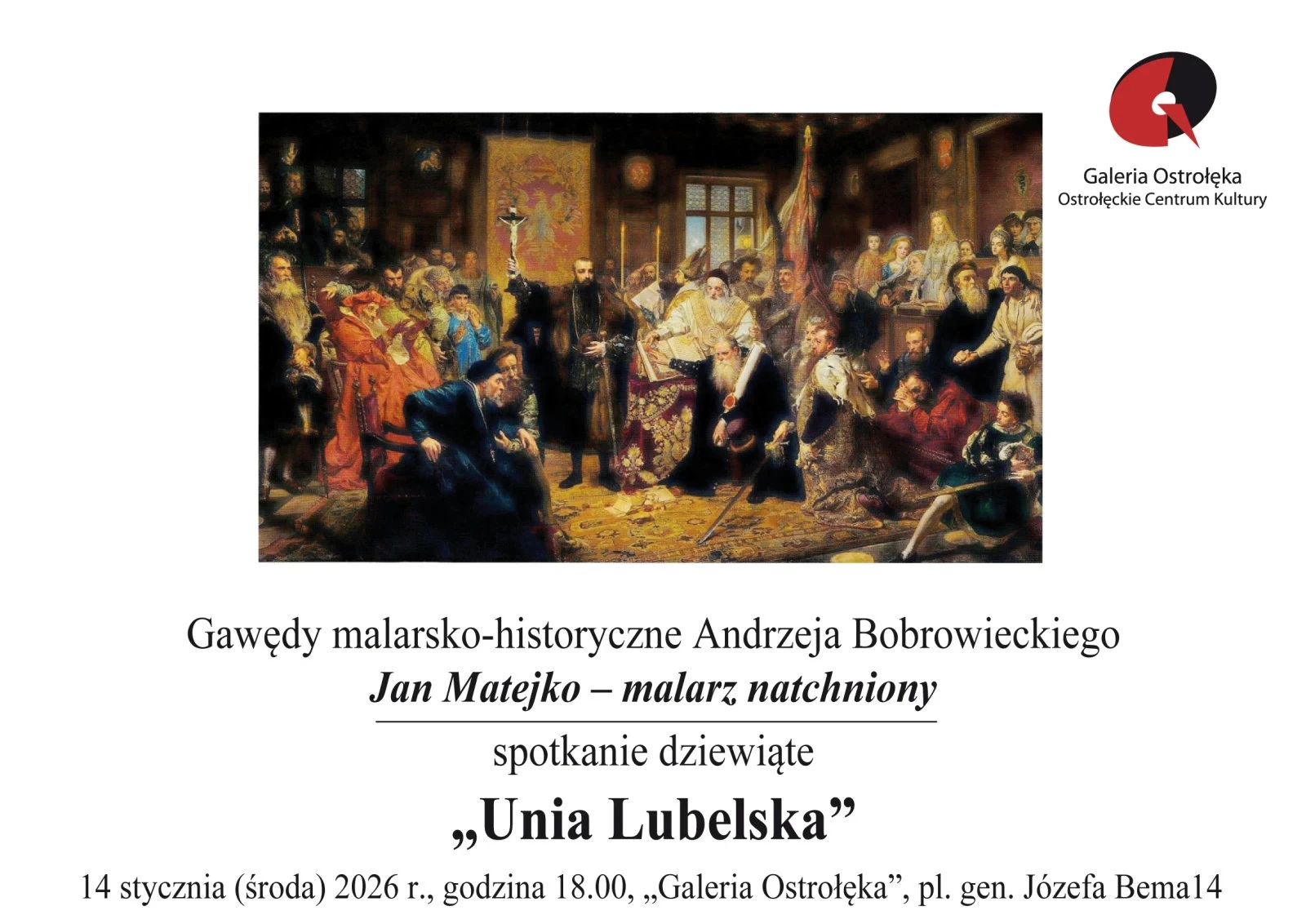Dzisiaj w Galerii Ostrołęka odbędzie się kolejne spotkanie z cyklu 'Gawędy malarsko-historyczne Andrzeja Bobrowieckiego”. Tym razem będzie ono poświęcone obrazowi Jana Matejki 'Unia Lubelska’.