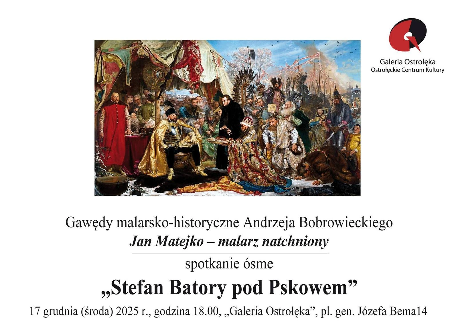 Już dziś (w środę) o godzinie 18.00 w Galerii Ostrołęka odbędzie się kolejne spotkanie z cyklu 'Gawędy malarsko-historyczne Andrzeja Bobrowieckiego”. Wydarzenie poświęcone będzie twórczości Jana Matejki – jednego z najwybitniejszych polskich malarzy historycznych.