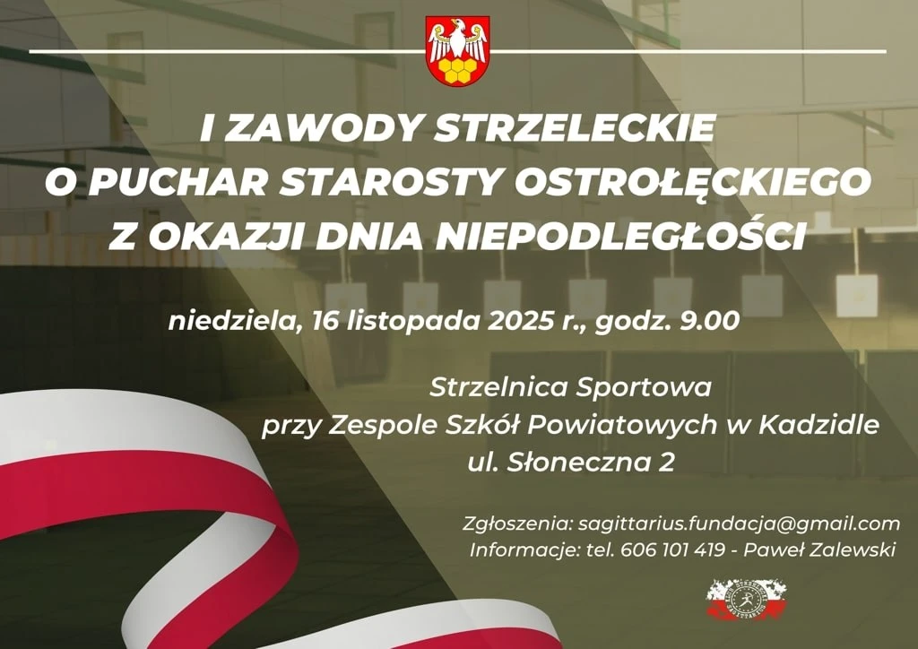 16 listopada , na strzelnicy przy Zespole Szkół Powiatowych w Kadzidle odbędą się I Zawody Strzeleckie o Puchar Starosty Ostrołęckiego.