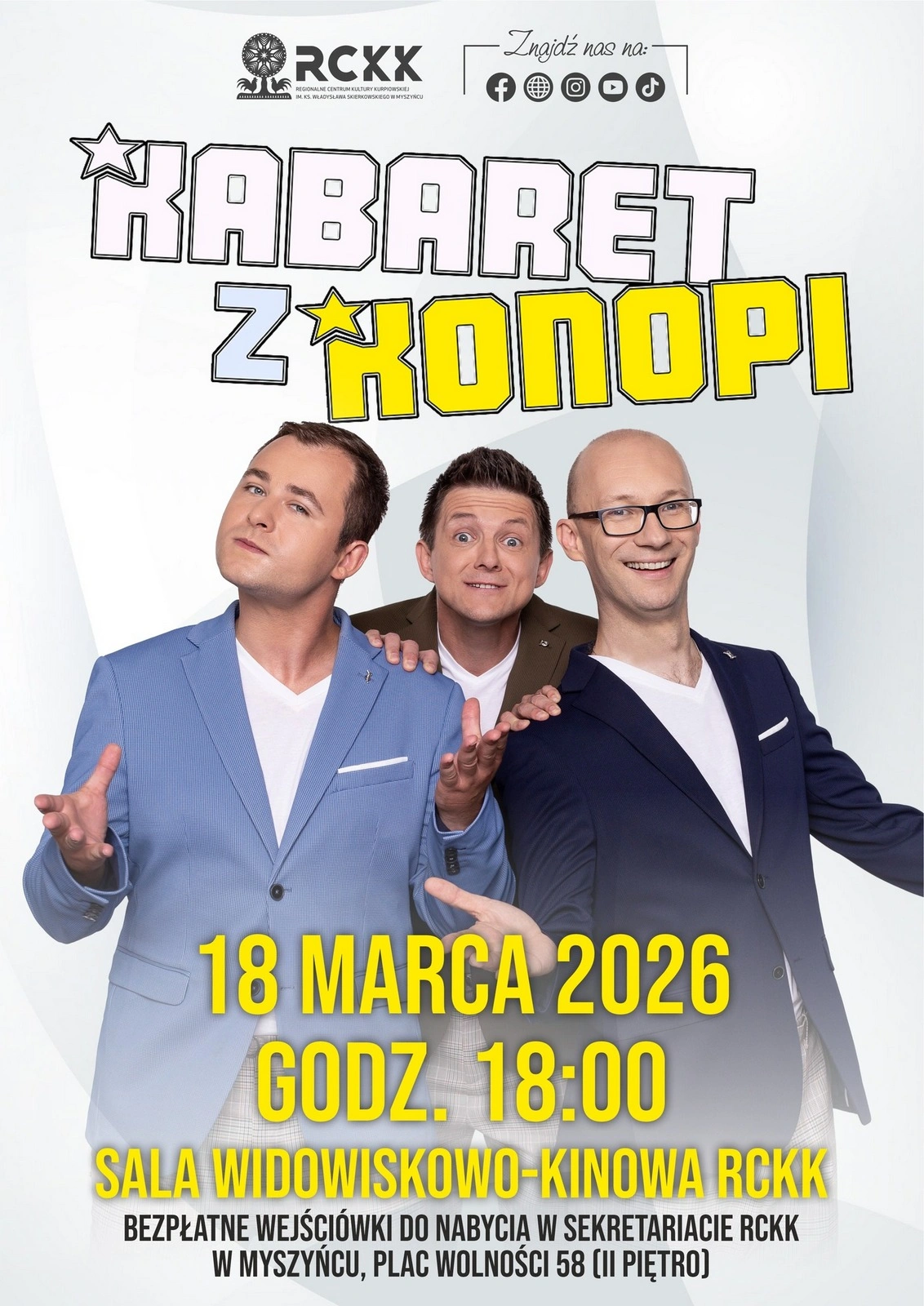 Regionalne Centrum Kultury Kurpiowskiej w Myszyńcu zaprasza mieszkańców regionu na wydarzenie artystyczne, które odbędzie się 18 marca o godzinie 18. Na scenie wystąpi popularny Kabaret z Konopi, znany z programów pełnych humoru i lekkiej, pozytywnej energii.