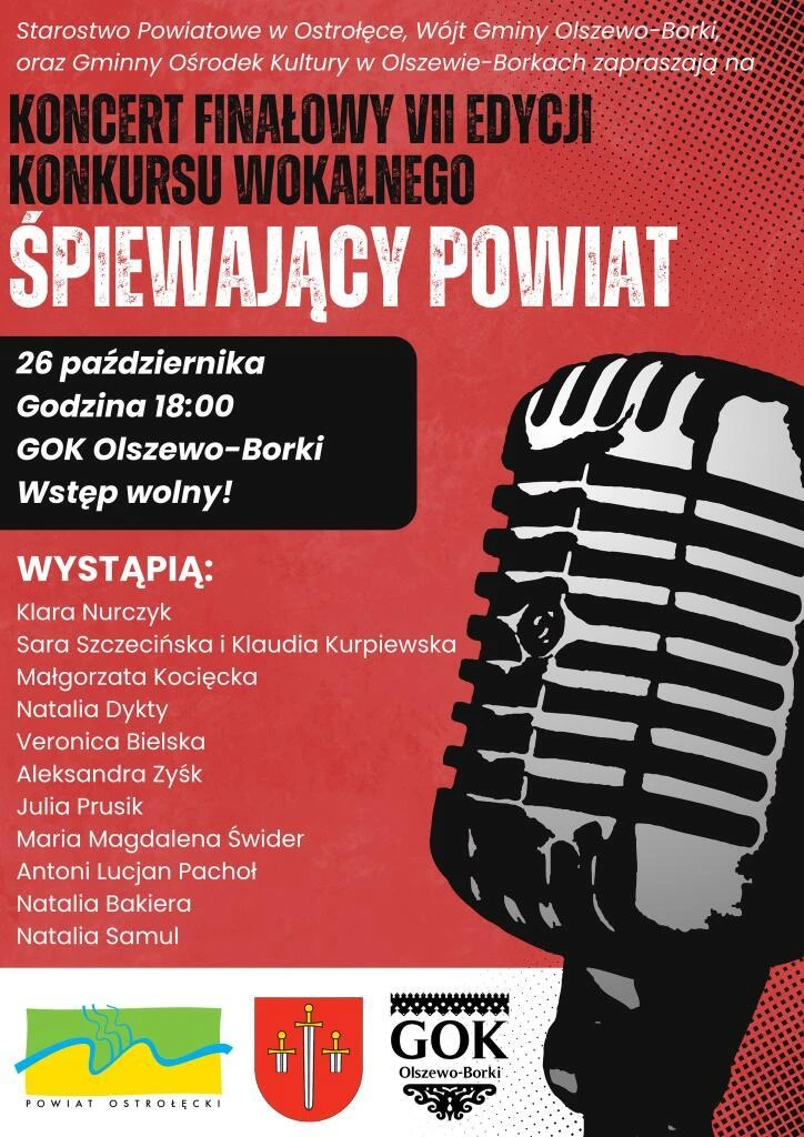 Już w niedzielę, 26 października w Gminnym Ośrodku Kultury w Olszewie-Borkach odbędzie się koncert finałowy VII edycji konkursu powiatowego 'Śpiewający powiat’. Poznamy zwycięzcę tegorocznej edycji oraz miejsca zajęte przez pozostałych finalistów.
