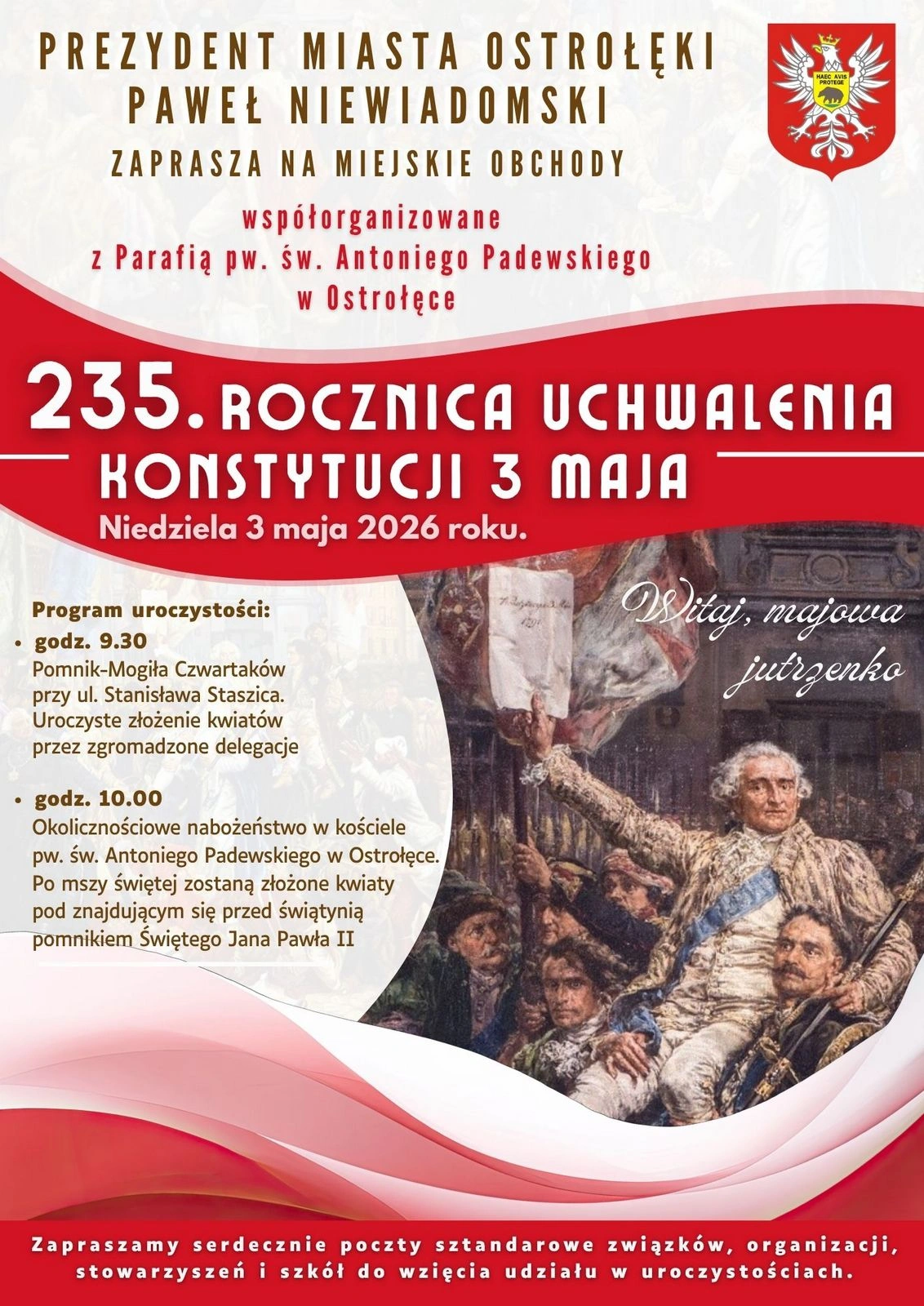 Prezydent Ostrołęki Paweł Niewiadomski zaprasza mieszkańców 3 maja na miejskie obchody 235. rocznicy uchwalenia Konstytucji 3 Maja, współorganizowane z parafią pw. św. Antoniego Padewskiego.