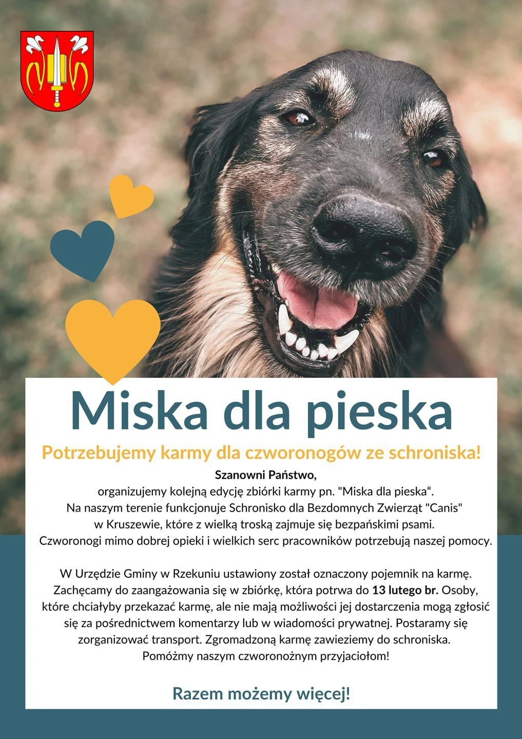 Na potrzeby zbiórki w Urzędzie Gminy w Rzekuniu ustawiony został specjalnie oznaczony pojemnik, do którego można przynosić karmę dla psów. Akcja potrwa do 13 lutego, dając mieszkańcom czas na włączenie się w pomoc w dogodnym dla siebie terminie.