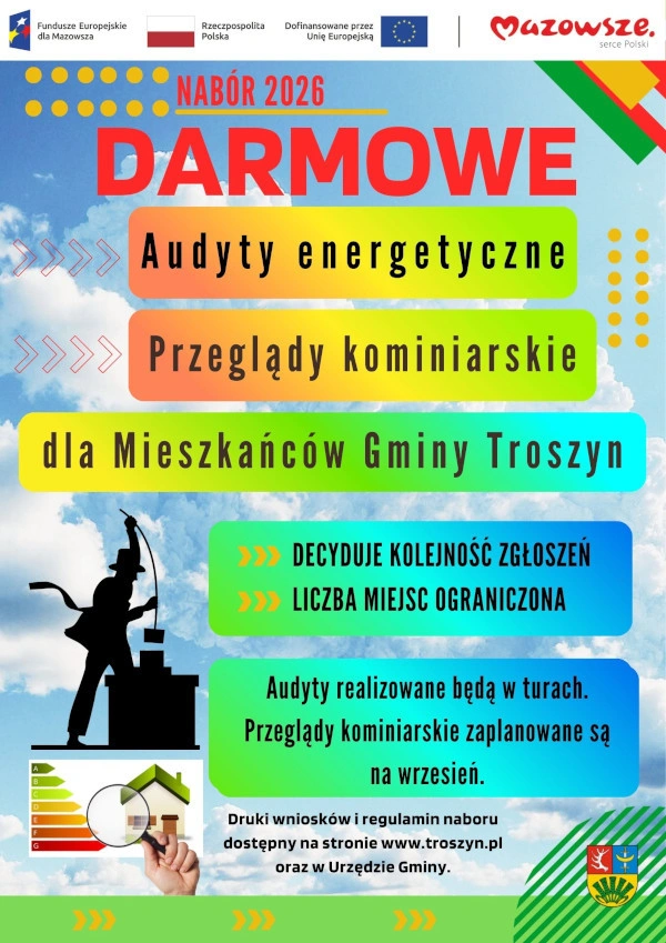 Gmina Troszyn prowadzi nabór wniosków na bezpłatne audyty energetyczne oraz przeglądy kominiarskie. Projekt realizowany jest przy wsparciu Unii Europejskiej w ramach programu Fundusze Europejskie dla Mazowsza 2021–2027, a jego celem jest poprawa jakości powietrza oraz zwiększenie efektywności energetycznej budynków.