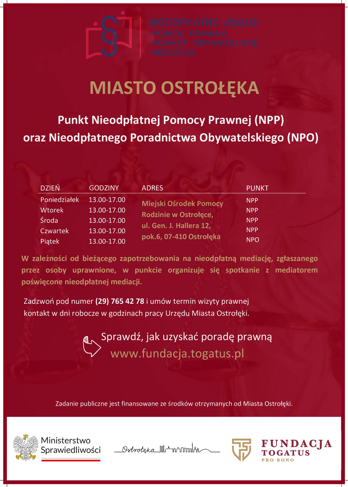 Fundacja Togatus Pro Bono, w ramach realizacji rządowego programu, udziela nieodpłatnego poradnictwa obywatelskiego w Ostrołęce.
