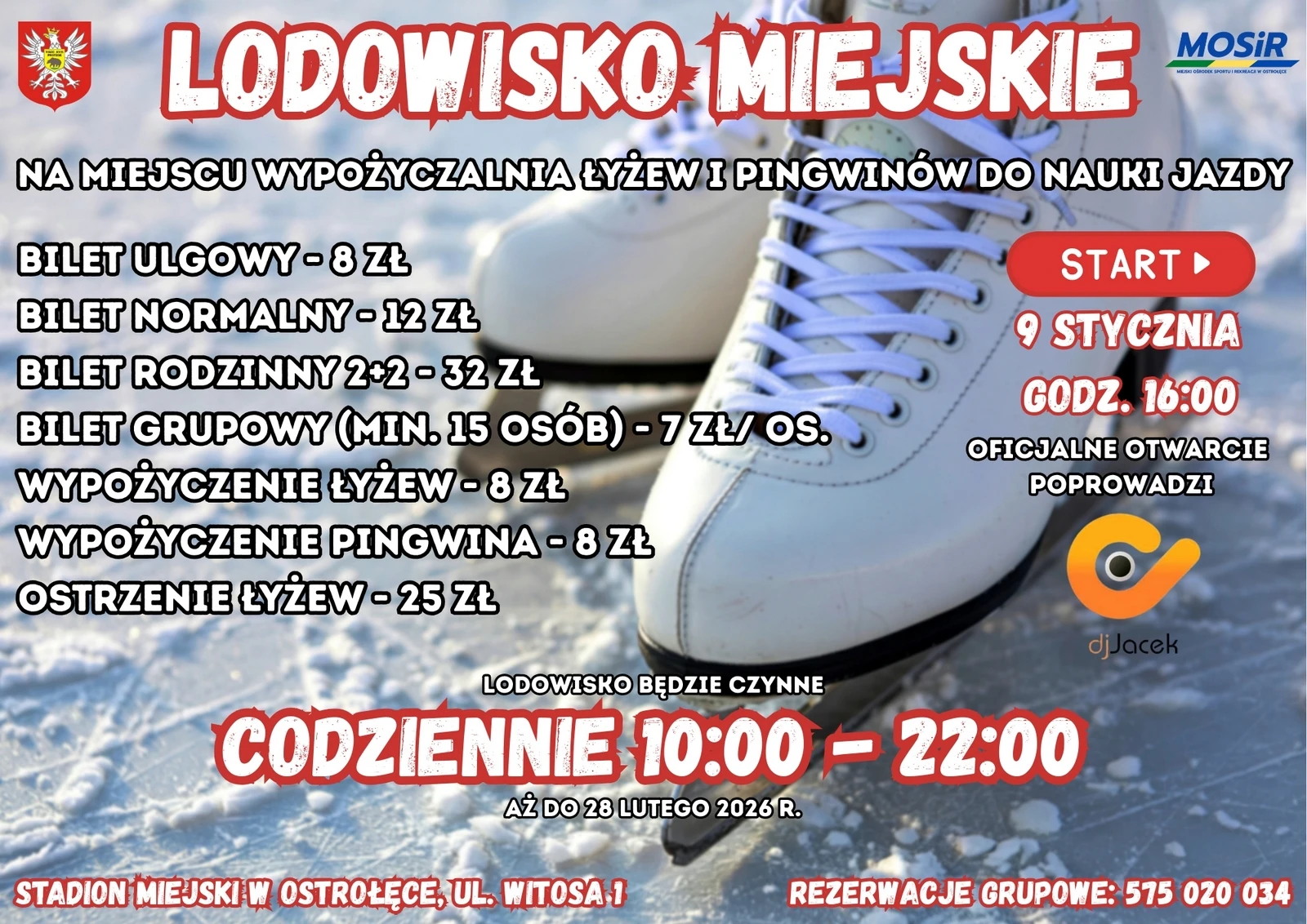 Lodowisko czynne będzie codziennie w godz. 10 – 22 do 28 lutego 2026 r. Oprawę muzyczną zapewni DJ Jacek.