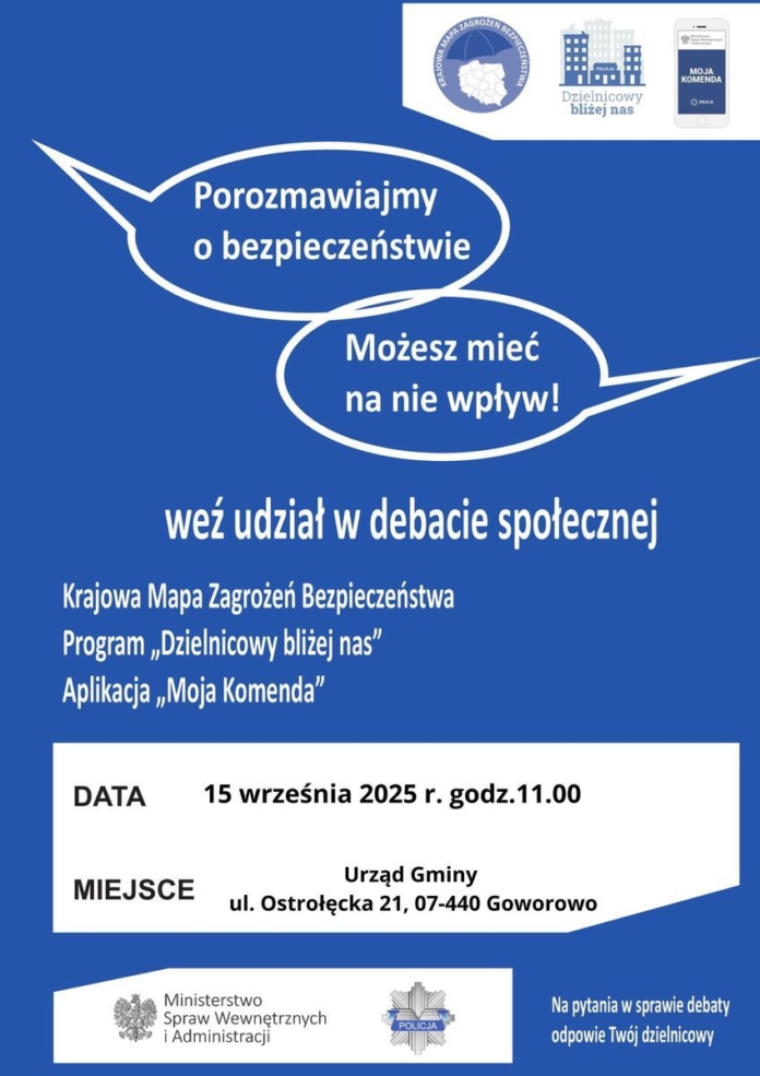 Policja zachęca mieszkańców do udziału w debacie i podzieleniu się uwagami dotyczącymi bezpieczeństwa.