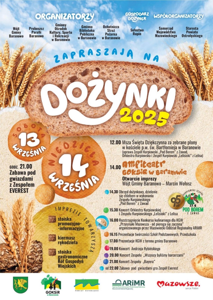 Gmina Baranowo zaprasza na tegoroczne Święto Plonów – Dożynki 2025, które odbędą się w niedziele 14 września. Wydarzenie stanowi okazję do wspólnego świętowania, podziękowania rolnikom za ich całoroczny trud oraz zbiory, a także do integracji lokalnej społeczności.