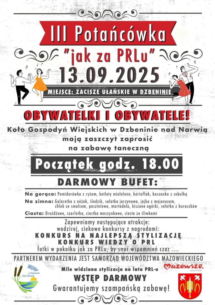 Koło Gospodyń Wiejskich z Dzbenina zaprasza na zabawę taneczną pn. 'Jak za PRL-u”, która odbędzie się w 13 września w Zaciszu Ułańskim. Rozpocznie się o godzinie 18. Wstęp na wydarzenie jest bezpłatny.