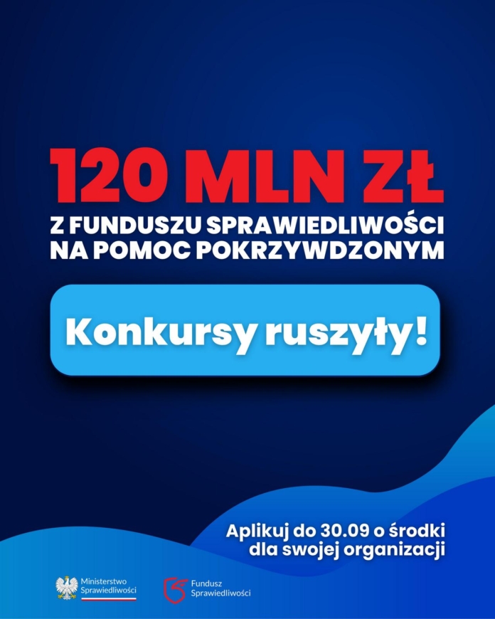 Ministerstwo Sprawiedliwości ogłasza konkurs dla organizacji pozarządowych, które prowadzą lub chcą prowadzić działalność polegającą na świadczeniu pomocy osobom pokrzywdzonym przestępstwem. Oferty można składać od 1 września. Na wsparcie przeznaczono 120 mln zł.