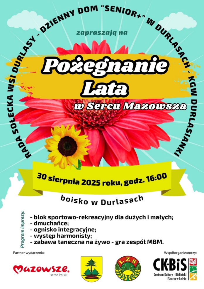 Rada Sołecka Wsi Durlasy, Dzienny Dom 'Senior+” w Durlasach, Koło Gospodyń Wiejskich 'Durlasianki” oraz Centrum Kultury-Biblioteki i Sportu w Lelisie zapraszają mieszkańców oraz gości na wydarzenie plenerowe pod nazwą 'Pożegnanie Lata w Sercu Mazowsza”.