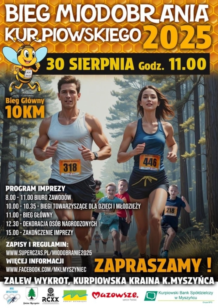 W sobotę, 30 sierpnia, odbędzie się XXVIII edycja Biegu Miodobrania Kurpiowskiego — wydarzenia sportowego, które łączy aktywność fizyczną z kurpiowską tradycją. Start biegu głównego na dystansie 10 km zaplanowano na godzinę 11:00 w Myszyńcu, a meta znajdować się będzie nad Zalewem Wykrot, w Kurpiowskiej Krainie.