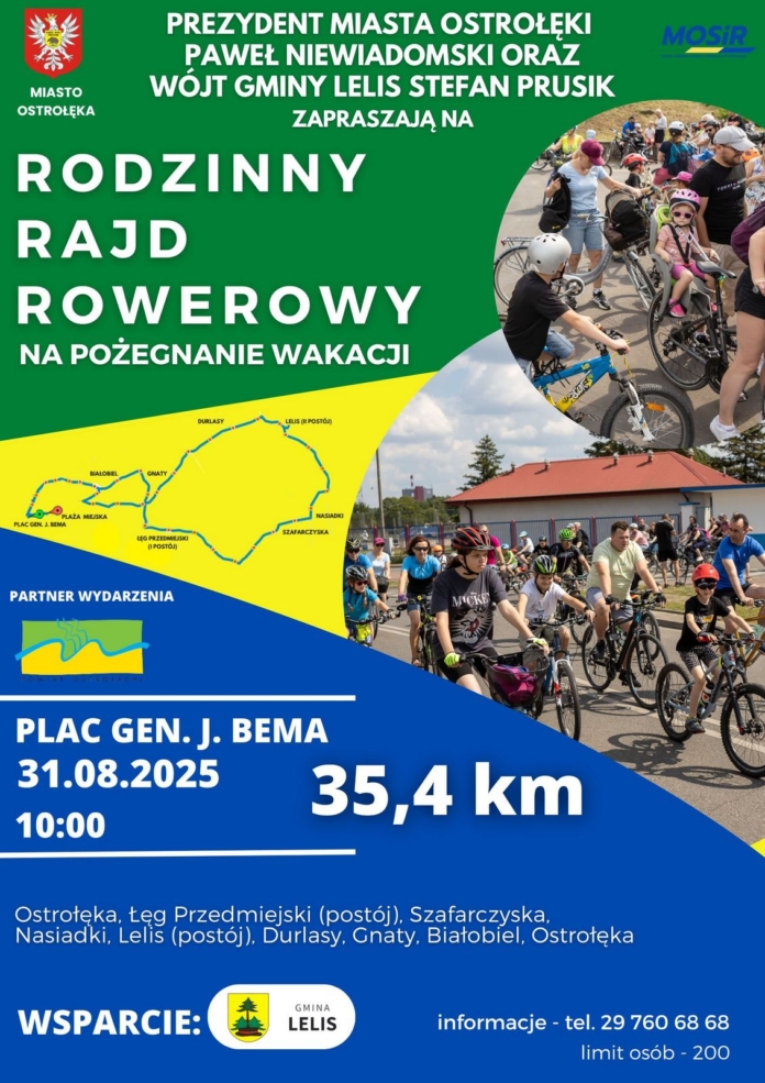 Prezydent Miasta Ostrołęki Paweł Niewiadomski oraz Wójt Gminy Lelis Stefan Prusik zapraszają miłośników rowerowych przygód na Rodzinny Rajd Rowerowy z okazji zakończenia wakacji.