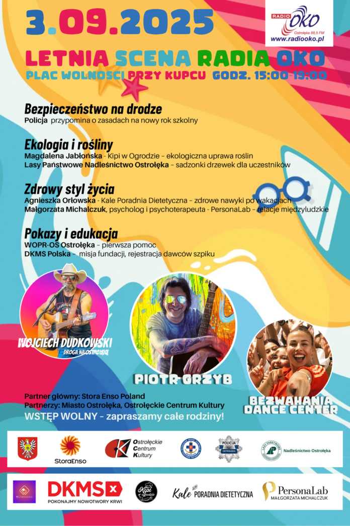 Letnia Scena Radia Oko zaprasza 3 września na Plac Wolności przy Kupcu. W godzinach 15:00–19:00 Radio Oko oferuje uczestnikom bogaty program edukacyjny, ekologiczny i rozrywkowy.