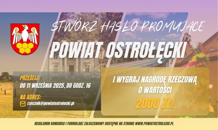 Starostwo Powiatowe w Ostrołęce zaprasza osoby pełnoletnie do udziału w konkursie na hasło promujące powiat ostrołęcki. Celem inicjatywy jest wyłonienie krótkiego, oryginalnego sloganu, który w sposób trafny i atrakcyjny odda charakter regionu.