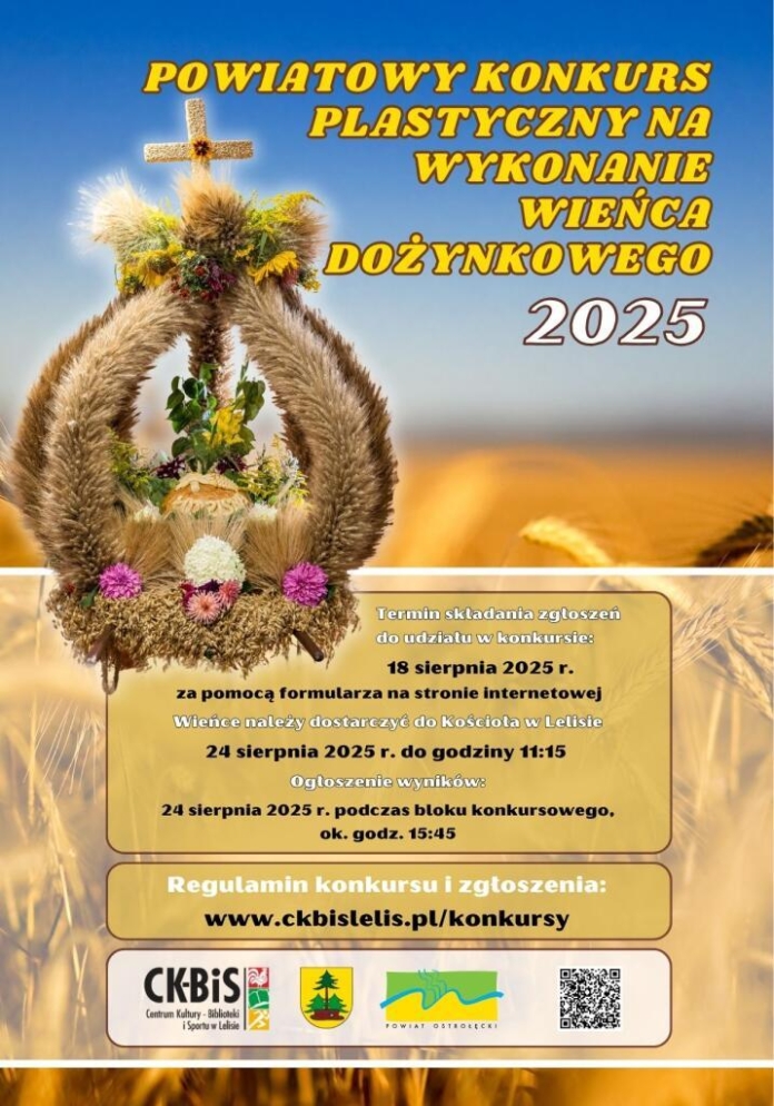 Centrum Kultury-Biblioteki i Sportu w Lelisie wspólnie z Powiatem Ostrołęckim zapraszają do udziału w konkursie na najpiękniejszy wieniec dożynkowy, organizowany w ramach Dożynek Regionalnych na Kurpiach.
