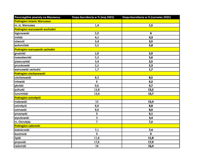 Na Mazowszu widać znaczne zróżnicowanie między powiatami. Najniższe bezrobocie utrzymuje Warszawa – 1,5%, najwyższe jest w powiecie szydłowieckim – aż 21,7%.