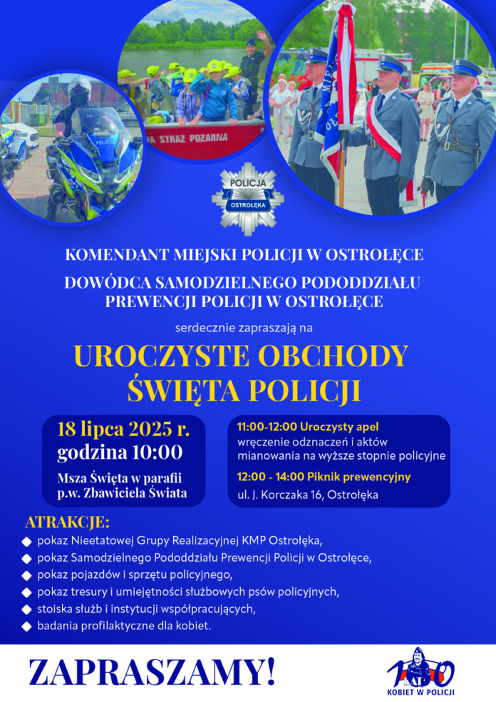 Już jutro obchody Święta Policji w Ostrołęce. Komendant Miejski Policji insp. Mirosław Olszewski oraz Dowódca Samodzielnego Pododdziału Prewencji Policji podinsp. Jacek Nowakowski zapraszają wszystkich mieszkańców do wspólnego świętowania. To będzie dzień pełen atrakcji.