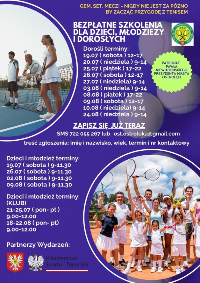 Ostrołęckie Stowarzyszenie Tenisowe zaprasza w wakacje na bezpłatne szkolenia tenisowe dla dzieci, młodzieży i dorosłych, które będą się odbywać na kortach ziemnych przy ul. Hallera 10. To idealna okazja, by rozpocząć przygodę z tenisem lub rozwinąć swoje umiejętności pod okiem doświadczonych trenerów.
