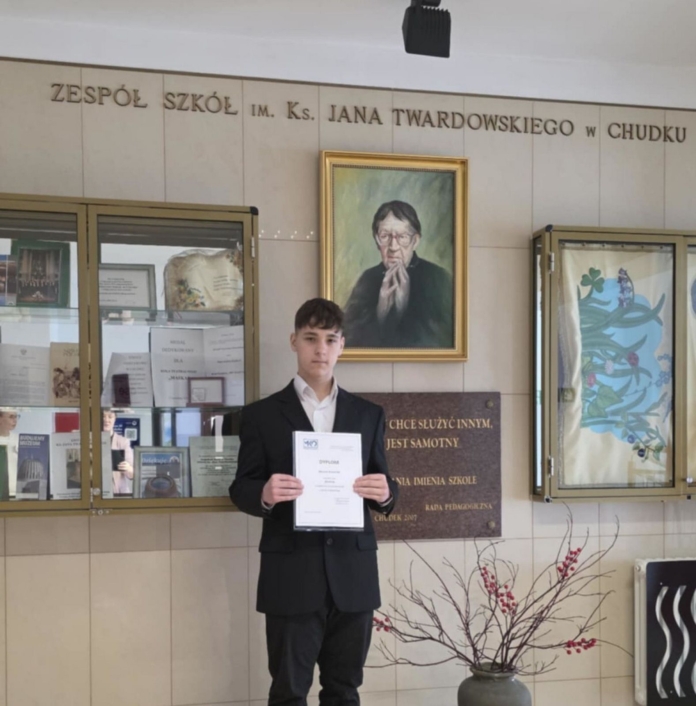 Marcin Kowalski, uczeń ósmej klasy Szkoły Podstawowej w Chudku został finalistą Wojewódzkiego Przedmiotowego Konkursu z Języka Angielskiego organizowanego przez Mazowieckiego Kuratora Oświaty.