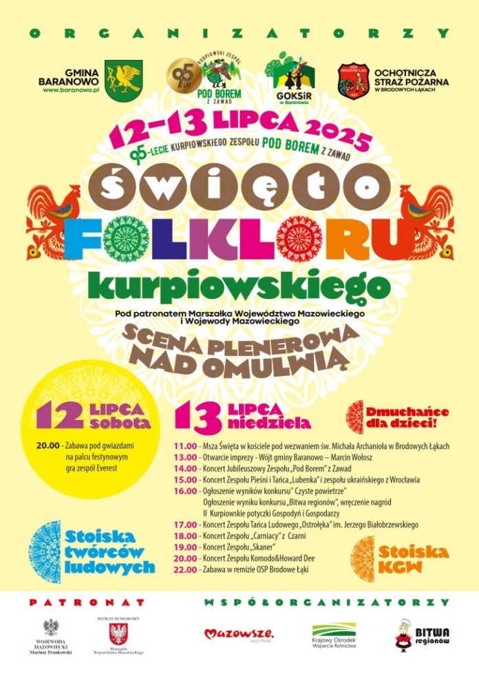 Gmina Baranowo zaprasza na Święto Folkloru Kurpiowskiego, które odbędzie się 12-13 lipca na scenie plenerowej nad Omulwią. Wydarzenie ma szczególny charakter, jest organizowane z okazji 95-lecia Kurpiowskiego Zespołu 'Pod Borem’ z Zawad.