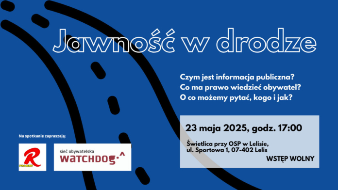 ’Jawność w drodze’ spotkanie poświęcone jawności życia publicznego odbędzie się 23 maja o godzinie 17 w świetlicy przy OSP w Lelisie (ul. Sportowa 1). Wydarzenie poprowadzi Szymon Osowski – prezes zarządu Sieci Obywatelskiej Watchdog Polska oraz dyrektor ds. strategicznych postępowań sądowych i edukacji prawnej.