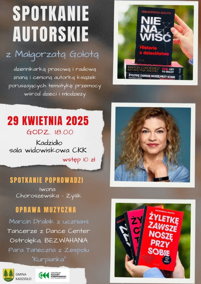 Spotkanie z Małgorzatą Gołotą – dziennikarką i autorką książek podejmujących trudne tematy hejtu, przemocy psychicznej i samobójstw wśród młodych ludzi odbędzie się 29 kwietnia o godz. 18 w Centrum Kultury Kurpiowskiej w Kadzidle. Mówi dyrektor placówki Paweł Łaszczych.