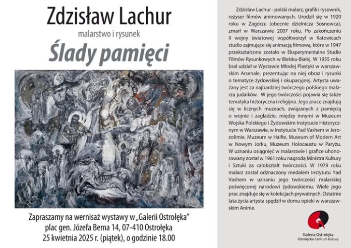 Galeria Ostrołęka działająca przy Ostrołęckim Centrum Kultury zaprasza 25 kwietnia miłośników sztuki na wernisaż wystawy malarstwa i rysunku Zdzisława Lachura (1920–2007). Ekspozycja nosi tytuł 'Ślady pamięci”. Uroczyste otwarcie rozpocznie się o godz. 18.