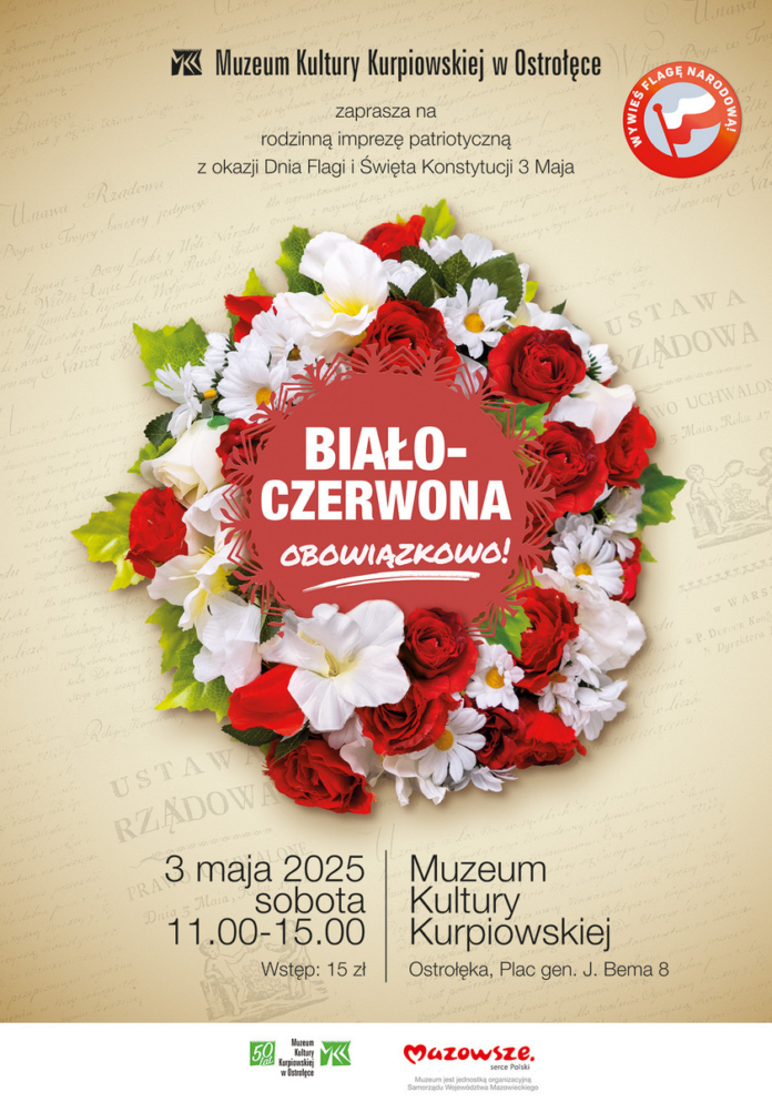 Muzeum Kultury Kurpiowskiej w Ostrołęce zaprasza do wspólnego uczczenia Dnia Flagi oraz Święta Konstytucji 3 Maja, podczas rodzinnej imprezy patriotycznej 'Biało-czerwona. Obowiązkowo!”. Będzie to okazja do poszerzenia wiedzy o Ojczyźnie, symbolach narodowych oraz integracji międzypokoleniowej.