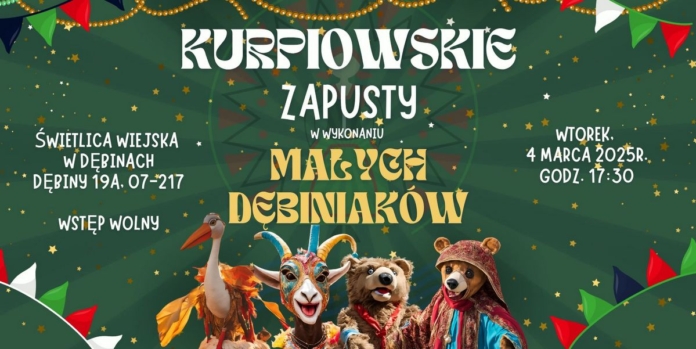 Koło Gospodyń Wiejskich w Dębinach 'Nad Stawem’ zaprasza na Kurpiowskie Zapusty, które odbędą się 4 marca o godzinie 17:30 w świetlicy wiejskiej w Dębinach.