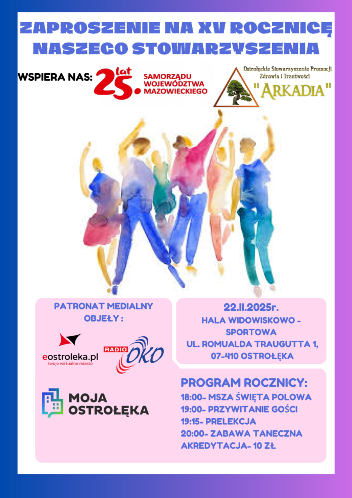 Stowarzyszenie Promocji Zdrowia i Trzeźwości Arkadia świętuje swój jubileusz 15-lecia. Z tej okazji 22 lutego w hali im. Arkadiusza Gołasia w Ostrołęce odbędzie się uroczyste spotkanie.