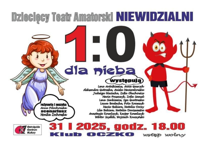 Dziecięcy Teatr Amatorski NIEWIDZIALNI zaprasza w piątek, 31 stycznia o godzinie 18 na premierę spektaklu 'Jeden zero dla nieba”. Wydarzenie stanowi wyjątkową okazję do zobaczenia młodych aktorów w niezwykłej historii rozgrywającej się w 'przestrzeni duchowej”, gdzie siły dobra i zła nieustannie walczą o ludzkie dusze.