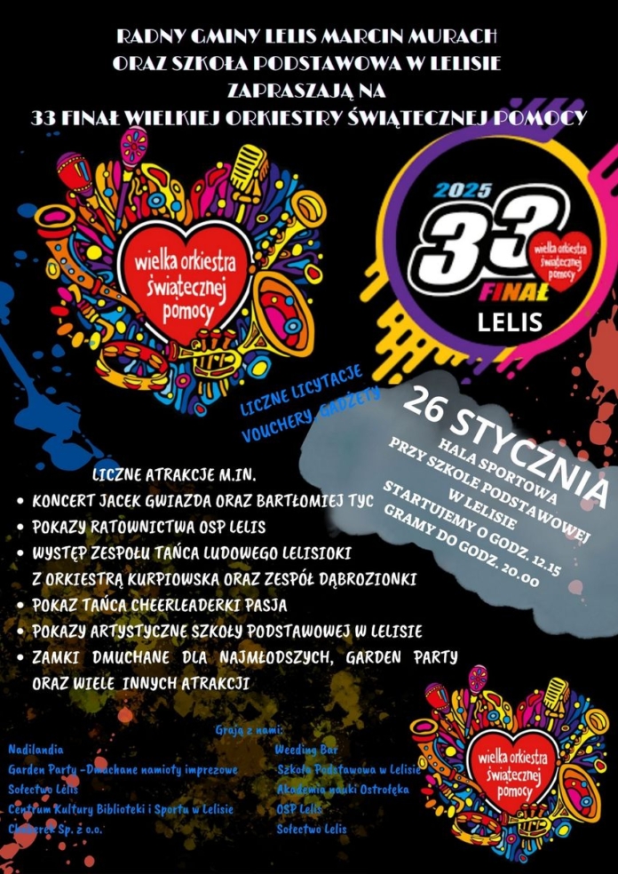Szkoła Podstawowa w Lelisie zaprasza do wspólnego czynienia dobra. Już w najbliższą niedzielę 33 Finał Wielkiej Orkiestry Świątecznej Pomocy. Odbędzie się w hali sportowej.