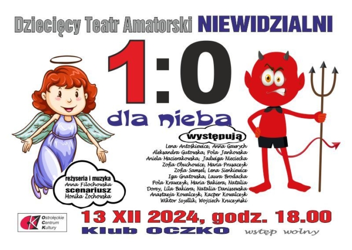 13 grudnia o godzinie 18 w Klubie Oczko odbędzie się niezwykłe wydarzenie teatralne, które zachwyci zarówno młodszych, jak i starszych widzów. Dziecięcy Teatr Amatorski NIEWIDZIALNI zaprezentuje spektakl 'Jeden zero dla nieba’, którego akcja przenosi widzów do 'przestrzeni duchowej’. To tam siły dobra i zła nieustannie toczą walkę o ludzkie dusze, oferując pełne emocji i refleksji widowisko.