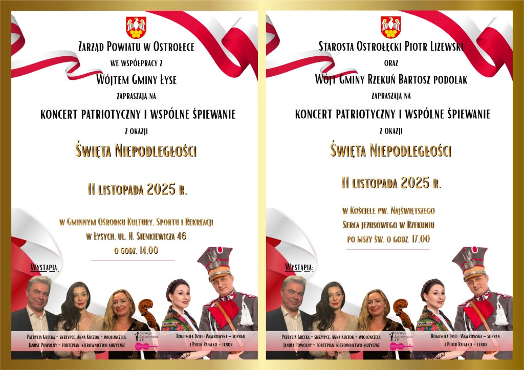 Powiat Ostrołęcki zaprasza mieszkańców do wspólnego uczczenia 107. rocznicy odzyskania przez Polskę niepodległości. Z tej okazji 11 listopada odbędą się dwa uroczyste koncerty patriotyczne – w Łysych i Rzekuniu.