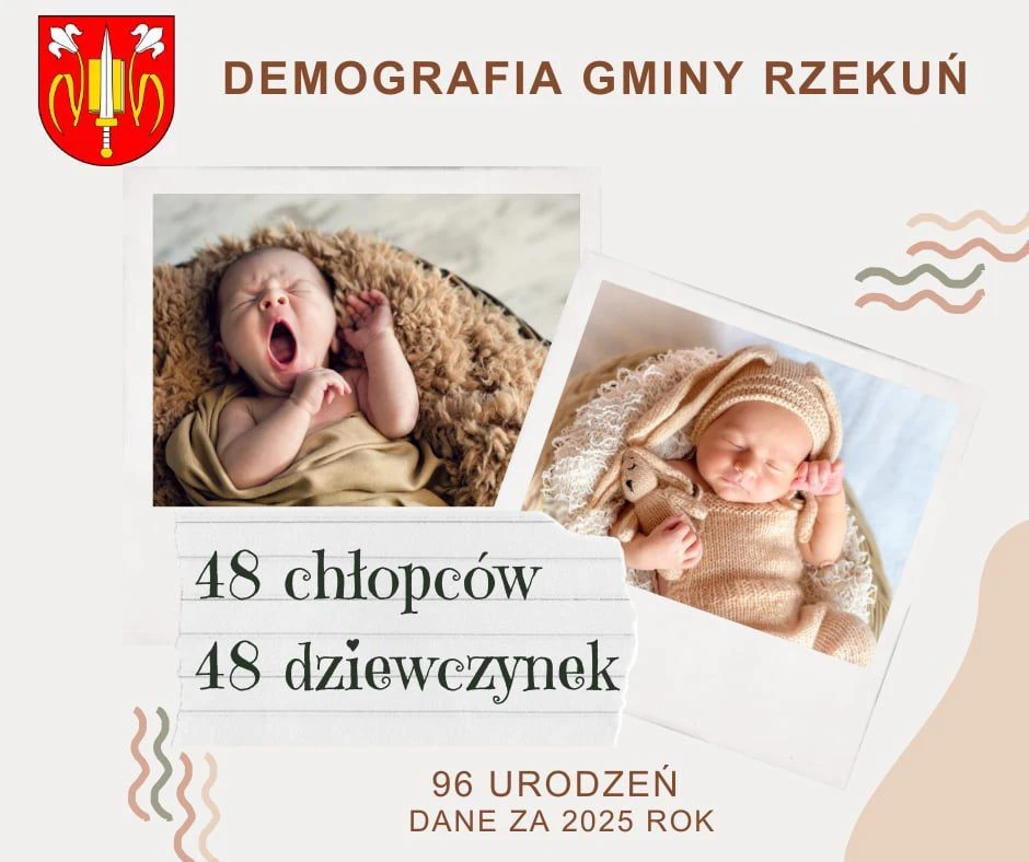 Demografia gminy Rzekuń pozostaje na dobrym i stabilnym poziomie. W 2025 roku na terenie gminy Rzekuń przyszło na świat 96 dzieci. Co ciekawe, zachowana została idealna równowaga płci – urodziło się po 48 dziewczynek i chłopców. Dla porównania, w 2024 roku liczba urodzeń była nieco wyższa i wyniosła 99. Różnica ta jest jednak niewielka i nie wskazuje na istotne zmiany demograficzne.