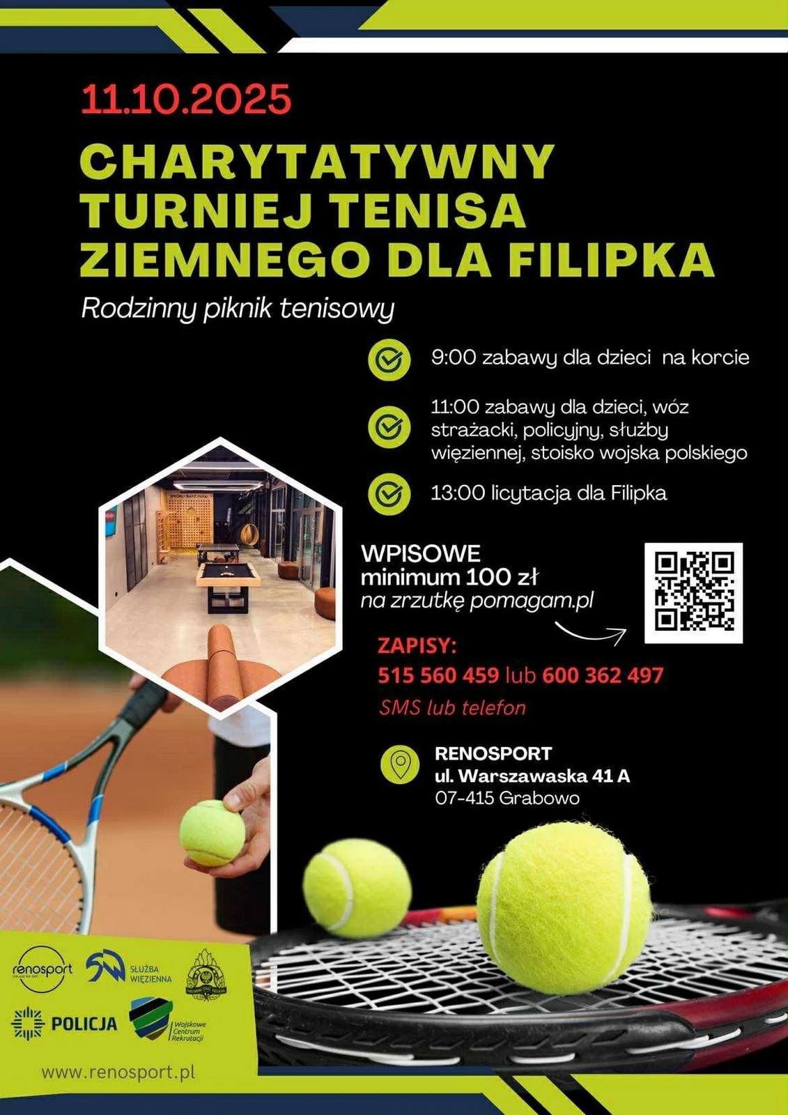 W programie znajdzie się wiele atrakcji zarówno sportowych, jak i rodzinnych. Start turnieju tenisowego (kategoria Open i Mundurowi) o godzinie 9. Będą również pokazy wozów strażackiego, policyjnego, służby więziennej oraz stoiska Wojska Polskiego. O godzinie 13 rozpocznie się emocjonująca licytacja charytatywna na rzecz Filipka.
