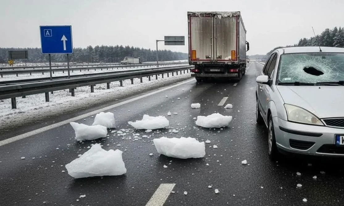 Spadający lód z dachu ciężarówek to dość częsty widok na drogach. Trafiony bryłą lodu pojazd może ulec poważnym uszkodzeniom, dochodzi również do wypadków, w których giną ludzie.