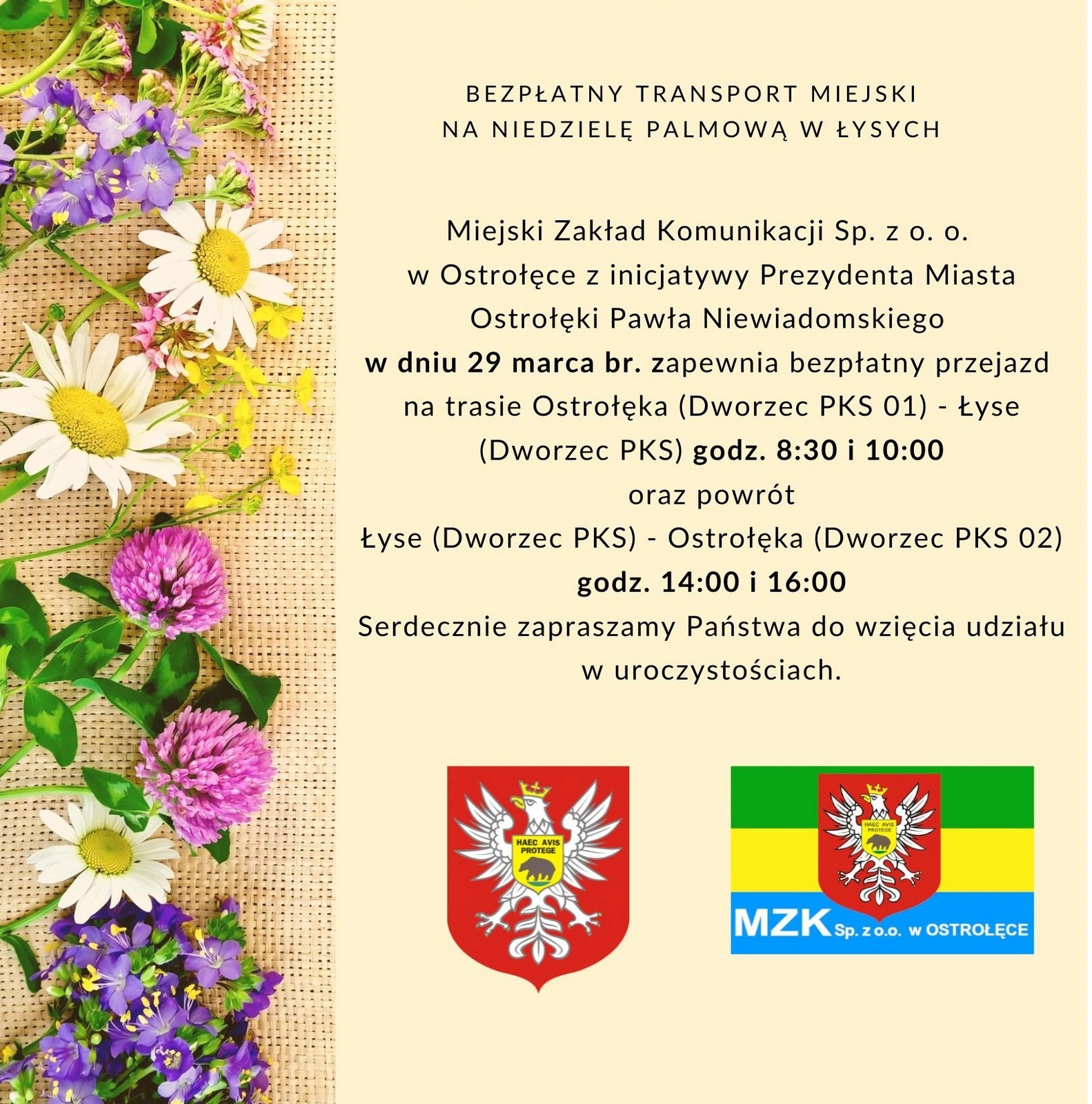 Z myślą o mieszkańcach Ostrołęki, zainteresowanych Niedzielą Palmową w Łysych przygotowano bezpłatny transport. Inicjatywa, podjęta przez prezydenta miasta Pawła Niewiadomskiego we współpracy z Miejskim Zakładem Komunikacji, ma ułatwić udział w wydarzeniu i zachęcić do wspólnego świętowania. Mówi Katarzyna Ogniewska, rzeczniczka prasowa Urzędu Miasta.