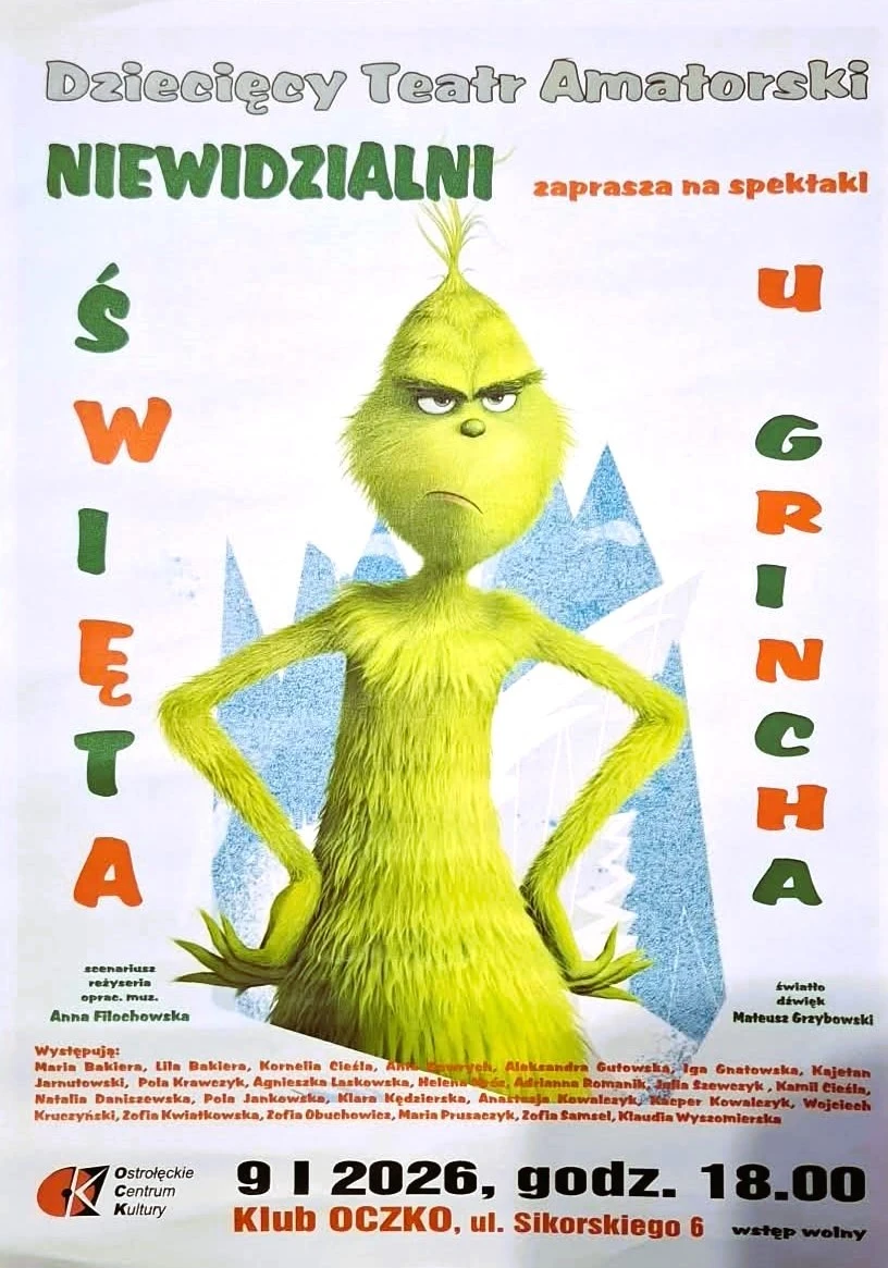 Klub Oczko OCK zaprasza 9 stycznia o godz. 18.00 na spektakl 'Święta u Grincha” w wykonaniu Dziecięcego Teatru Amatorskiego 'Niewidzialni”. Wstęp na przedstawienie jest wolny, a wejściówki będzie można odebrać na godzinę przed spektaklem.